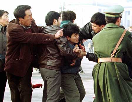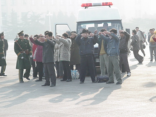 在上述8分钟的时间里,悠扬、祥和的“法轮桩法”炼功音乐一直在天安门广场回响。据悉,警车在冲向炼功学员的途中撞伤一位女游客。有两个在现场拍照的西方记者被警察拦截。