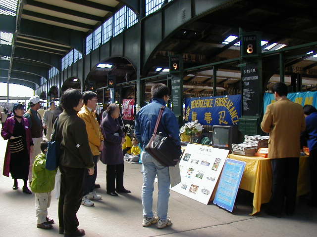 学员们十人左右一组不断地演炼着五套功法。四、五位学员在展台前向人们发放资料、介绍大法并耐心地解释人们提出来的各种问题。有不少人当场买了《转法轮》和教功录像带。有的学员怀着一片善心,向每一个展位赠送了大法资料。