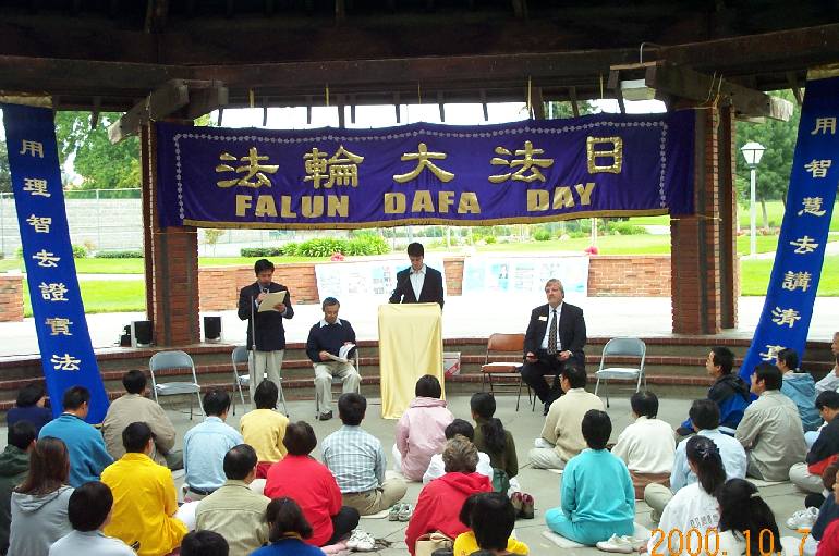 庆典仪式在集体炼功活动后开始。学员代表发言,桑尼维尔Sunnyvale市长温瑞特Voreitter女士委派代表市府议员福勒Fowler先生到场发言并宣读“法轮大法日”公告,国会议员艾秀(Eshoo)女士也发来贺信。学员向市长、市府议员及公园管理员们赠送大法书一套及“法轮大法之友”奖牌,已感谢他们对法轮大法修炼者的支持。整个一个小时的仪式热烈、隆重而充实。本市社区报的记者、中文媒体记者都作了采访报道。