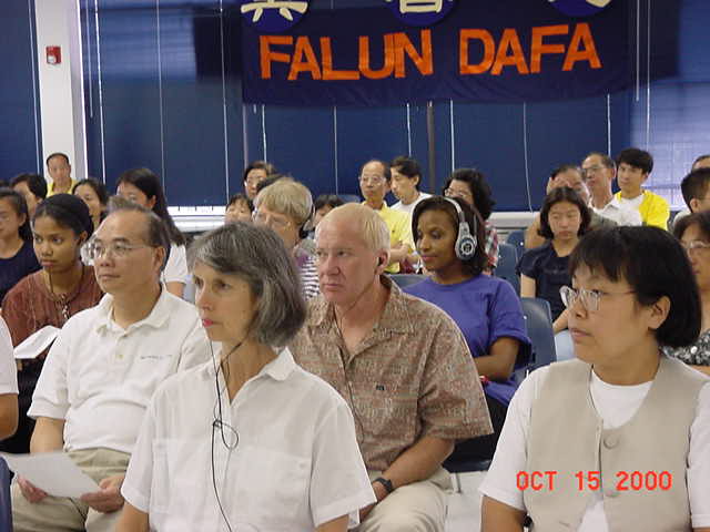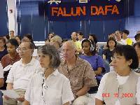 在“法轮大法周”庆祝仪式上,两位事业有成的高科技公司总裁,西人法轮功学员发言,讲述大法给他们的生活所带来的受益。他们指出:法轮大法的修炼不但不和他们的科技事业相抵触,而且使他们的精神轻松,精力充沛,更有助他们事业的发展。