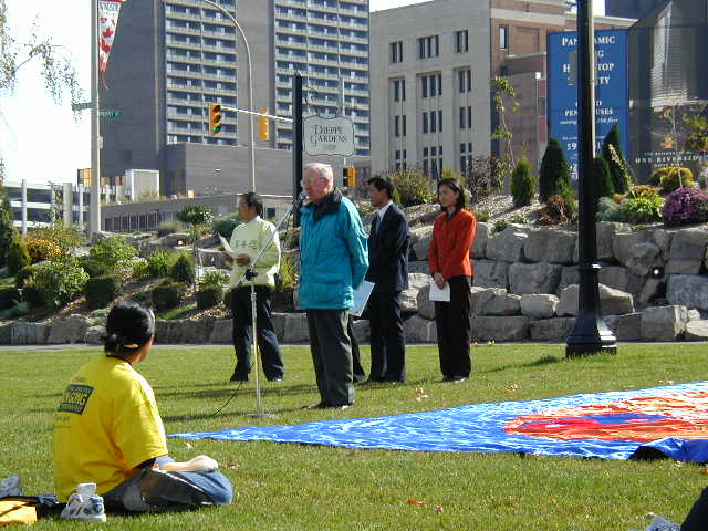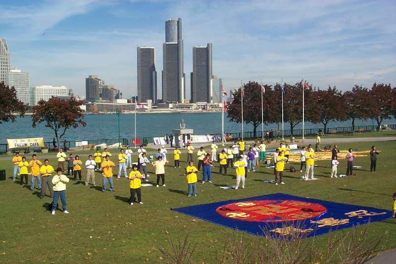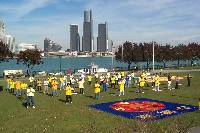 在清清的底特律河岸,五彩的气球洋溢着节日的气氛,沿河岸的“法轮大法图片回顾展”令众多的路人驻足观看,对中国政府的残酷镇压深表不解。中午时分,在一片平静祥和的炼功音乐中开始了我们的庆祝活动。大法弟子一如既往,向世人展示着五套功法。祥和的炼功场面顿令公园立刻改观,连当时在场的CBC摄影师也不禁感慨,这一切是这样美好。随后,在约半小时的庆祝会上学员宣读了新闻公告,温莎市褒奖,以及回顾了加拿大总督写给加拿大法轮大法周的贺信。温莎市国际特赦组织分部的科罗列教授,当听到法轮大法周庆祝活动的消息后,特地赶来表示祝贺并对中国法轮大法学员及其人权状况深表关注。81岁高龄的教授发言后高兴地对一位本地学员说,我的听觉好了不少。