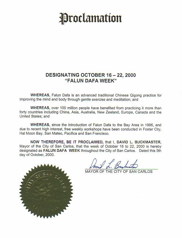 现在,因此我,圣卡洛斯市市长大卫.巴克麦斯特特此宣告2000年10月16日到10月22日为全圣卡洛斯市法轮大法周。签署日期: 2000年10月5日。