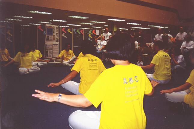 一个多小时炼功结束之后,一些员工上前与学员们交流。一位专程从夏威夷飞来参展的田径教练,与我们交流了很多,他学过佛教和多种气功,十分喜爱我们展示的法轮功法,我们知道他远道而来特意送给他教功录像带和大法资料,他非常感动,合十称谢。一位老工程师练过其它气功,他告诉我们他感受到很强的能量流在我们周围,并当即表示要学法轮功,并借走了教功录像带。一些员工连连称赞法轮功动作庄严优雅而且免费教功,他们说中国政府镇压法轮功实在不可理喻,不少人留下姓名和电话表示希望参加即将在周末举办的洪法班。
