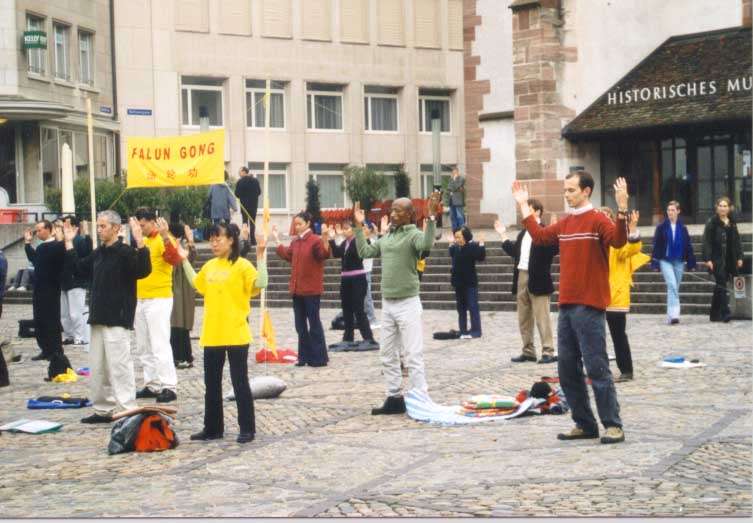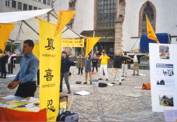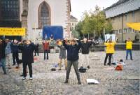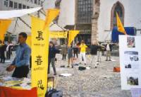 大部分学员随着悠扬的音乐在广场上向人们展示我们的五套功法。另一部分学员在放满德,法,英,中四种语言的宣传资料的桌前回答行人的各种问题。还有几个学员在广场前的人行道上分发传单。