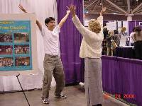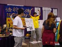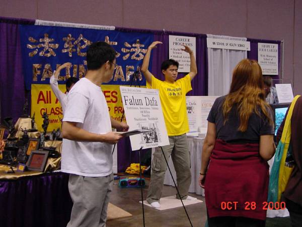 在为期3天的参展活动中,学员们向与会的二万一千名美国的民众和团体介绍法轮大法。展台上,金字蓝底的法轮大法和真善忍十分醒目。很多人驻足观看学员的炼功表演和我们播放的录象。有些人向我们询问江泽民一伙镇压法轮功的新闻并表示支持我们。有些人对我们表示赞扬与鼓励,其中有些人当场学功。学员们还耐心的向不知道法轮功的人们作了介绍。