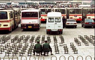广场上一辆辆抓满了大法弟子的公交车缓缓开走,“法轮大法好”、“法轮大法是正法”、“还师父清白”,车内大法弟子的高喊声震撼了整个苍穹,弟子们探出头流着热泪向人群挥手,告诫他们回去好好了解一下法轮功,不要错过机缘。