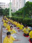 身着黄色T恤衫,上写:“中国停止镇压法轮功”的字样,成员们在铜锣湾地区做起了慢动作炼习。