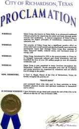 鉴于,法轮功现在瑞奇生市,达拉斯/Ft.渥斯交界地区有许多炼功点,并且所有的传授班和集体炼功都由志愿者组织,并向公众免费提供。