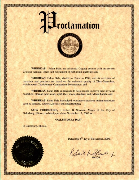 同一天,伊利诺伊州的著名旅游小城盖尔斯堡(GALESBURG),在了解大法真相后,批准十一月十二日为“法轮大法日”。几位学员驱车往返六小时,将大法资料发往小城,并在图书馆举行了两小时的讲座。