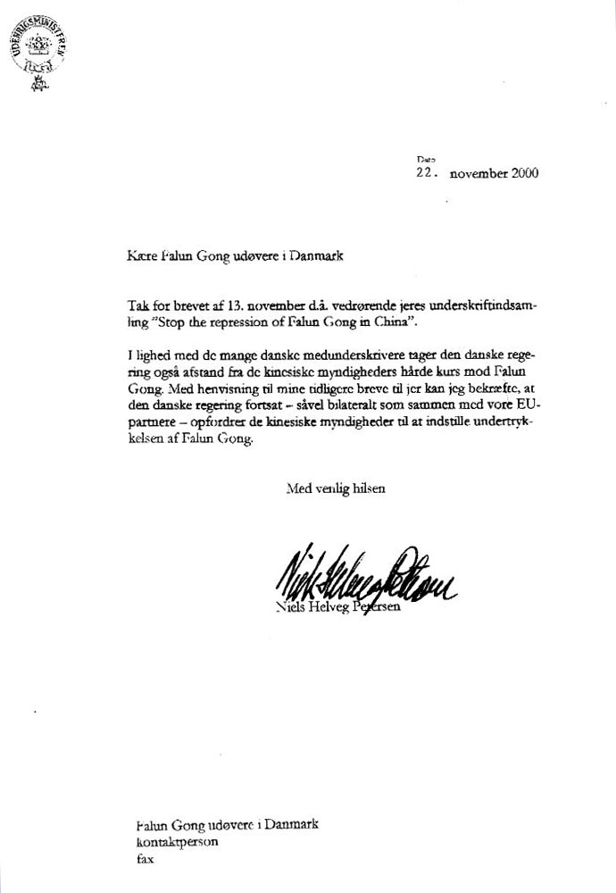 【明慧网2000年11月23日】11月22日丹麦外长第三次给法轮功学员的回信,表示丹麦政府将继续要求中国政府停止镇压法轮功。回信全文如下: