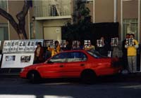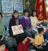 一如往昔,请愿在和祥平静的气氛中进行着,有人在路旁分派说明真象的中英文材料,有人静静地打着横幅。不同的是有这样一个横幅:“镇压法轮功是国家机密??”,“抗议审判滕春燕”。