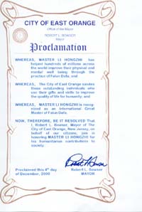 新泽西州东桔市市长罗伯特.宝瑟(Robert Bowser)先生近日发布公告,嘉奖法轮大法创始人李洪志大师。