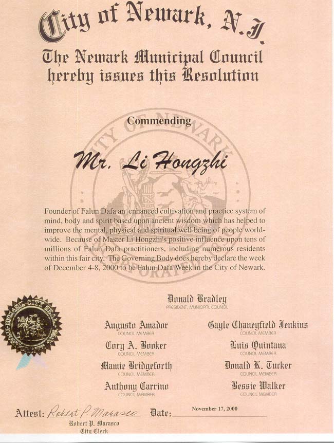 新泽西州的最大城市-纽瓦克市市议会于2000年11月17日通过议会决议,嘉奖法轮大法创始人李洪志大师。并鉴于李洪志大师对数千万法轮大法修炼者,其中包括纽瓦克市的无数市民的积极影响,市议会决定宣布2000年12月4日至8日为纽瓦克市的“法轮大法周”。