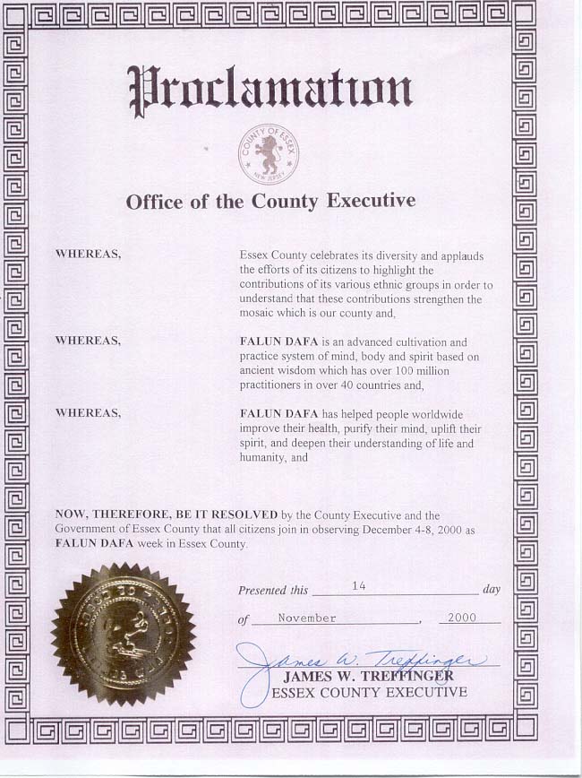 继去年9月12日,新泽西州艾赛克县县长Treffinger先生发布表彰李洪志大师的嘉奖令后,鉴于法轮大法对全县人民的特殊贡献,Treffinger先生又于今年11月14日再次发布通告,宣布2000年12月4日至8日为艾赛克县的“法轮大法周”。