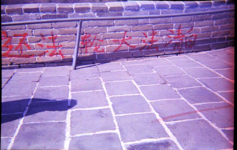 16日早晨,我们来到北京,我们立即赶到天安门,在正阳门上用红漆喷上了“还法轮大法清白”七个大字,安全离开后,我们又赶到八达岭长城,在这个旅游胜地喷了两个“还法轮大法清白”,和一个“法轮大法”“真善忍”。