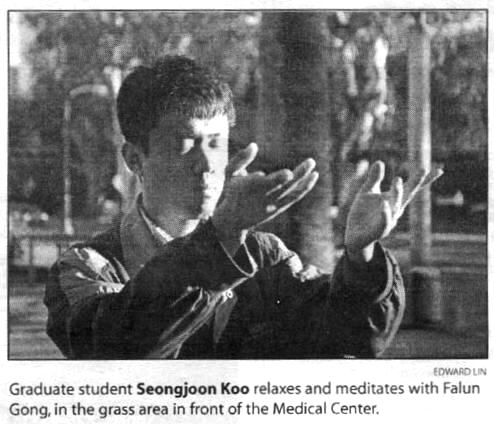 在我们边走边发资料时,很多人大叫,“法轮功,我在今天的《布鲁日报》上看到你们了。”原来,加州大学洛杉矶分校校报《布鲁日报》(Daily Bruin)记者对几位在校法轮功弟子采访后,写了一篇“学生们希望为法轮功获得支持”的报导,刊登在头版。还有一位从叙利亚来的外国留学生仔细向我们询问学功的地点,今天一大早,他就出现在我们的炼功点,一小时内,他就学会了五套功法。