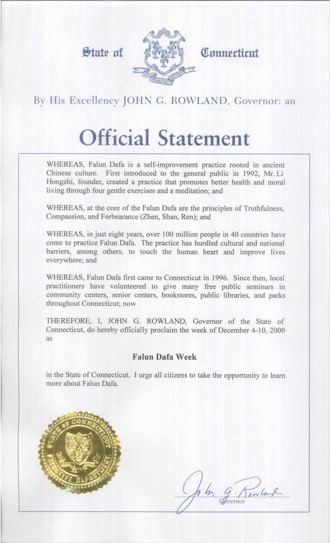 我竭诚鼓励所有康州民众都借此机会进一步了解法轮大法。