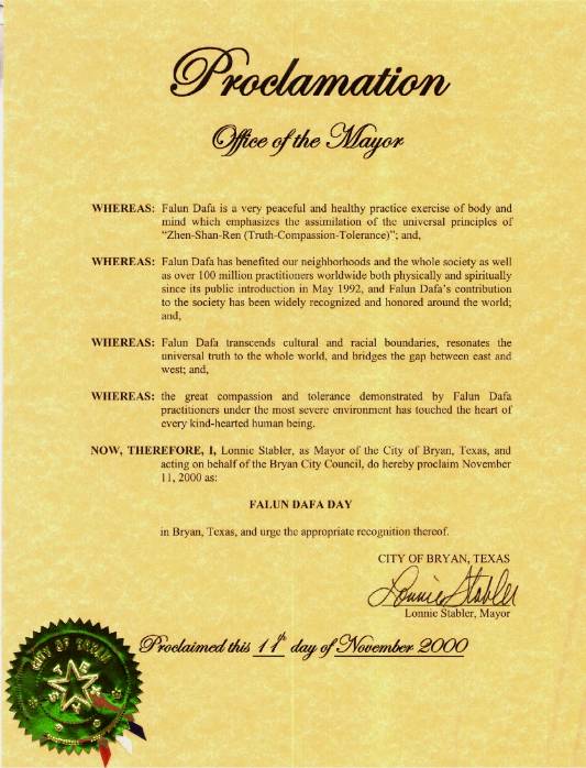 因此,我,龙力·斯达伯乐,德州布莱恩市市长,代表布莱恩市议会,在此宣布2000年11月11日为德州布莱恩市