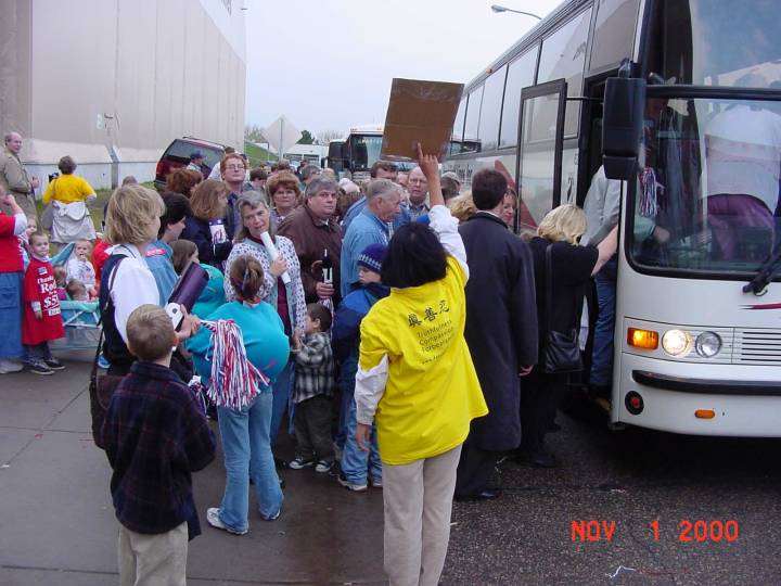 10月30日中午民主党总统候选人高尔的太太在明州会见了约五百多名高尔的支持者。主持会议的明尼阿普里斯(MINNEAPOLIS)市长当众声明:“我们支持法轮功。”她的话使人们的目光不约而同的投向了身穿黄T恤衫的大法弟子们。活动结束后,学员们摆出的大幅宣传真相的彩色板报,吸引了很多人的注意力,大部分人都拿到了法轮功的传单。一位妇女想拍照我们的板报,学员就送了她一份小尺寸的板报。她连连表示感谢。有两位学员和高尔的太太进行了简短的谈话。