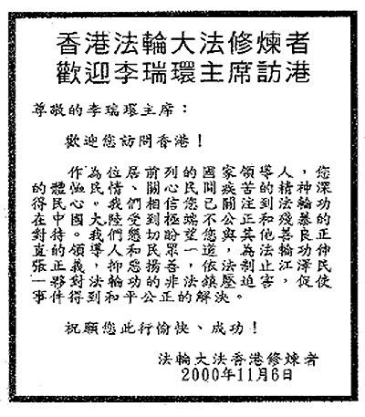 镶有红色(共产党的颜色)边框的广告上写到“香港法轮功学员欢迎李瑞环主席的访问”。