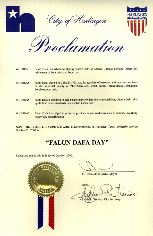 鉴于,法轮大法,帮助人类维持诚实、谦逊、忠诚和无私等珍贵的传统美德;
