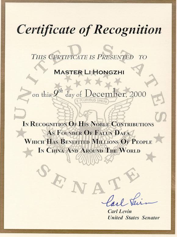 此证书于2000年12月9日特授予李洪志大师,向他作为法轮大法的创始人为中国和世界千百万人民作出的崇高贡献致敬。
