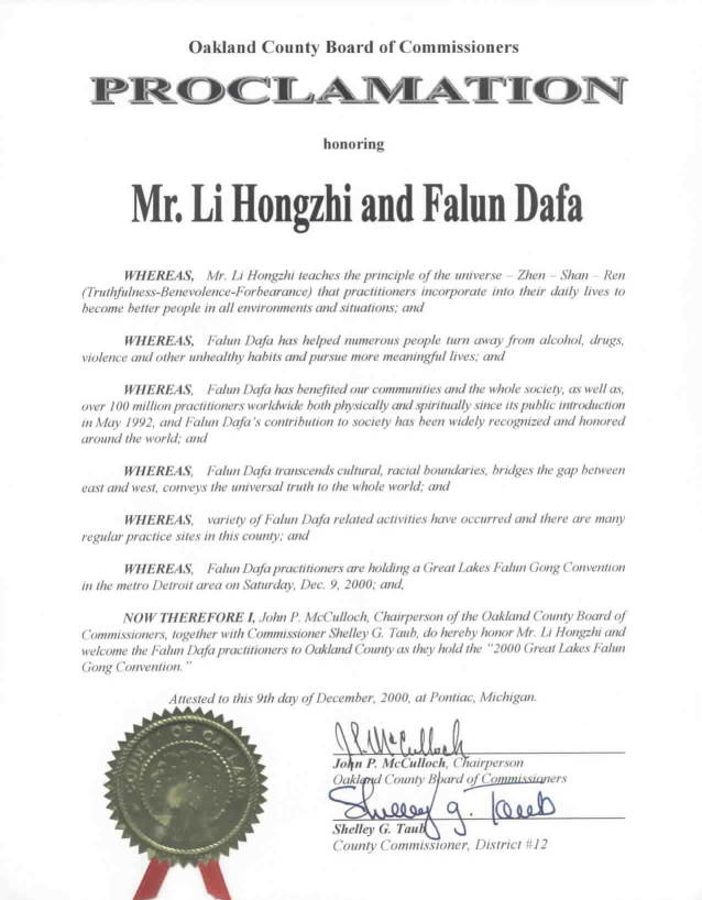 为此, 我, 约翰 P 麦克古劳克, 奥克兰郡议会议长,及议会专员,施爱莉 G. 陶博, 郑重奖誉李洪志先生,并欢迎所有法轮大法修炼者在参加所举办的“2000年法轮大法研讨活动”时到奥克兰郡访住。
