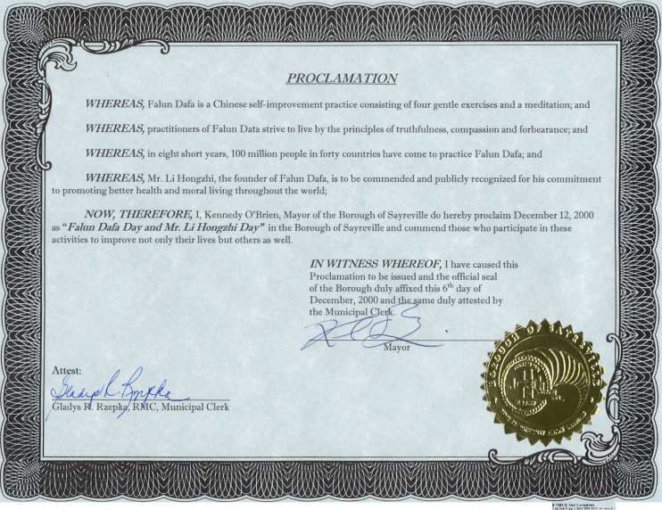 因此,现在,我,肯尼迪·奥布岚,赛芮维尔市市长,在此宣布2000年12月12日为赛芮维尔市“法轮大法日和李洪志先生日”,并奖励那些为了不仅仅改善自我,也为了他人而参与这些活动的人们。