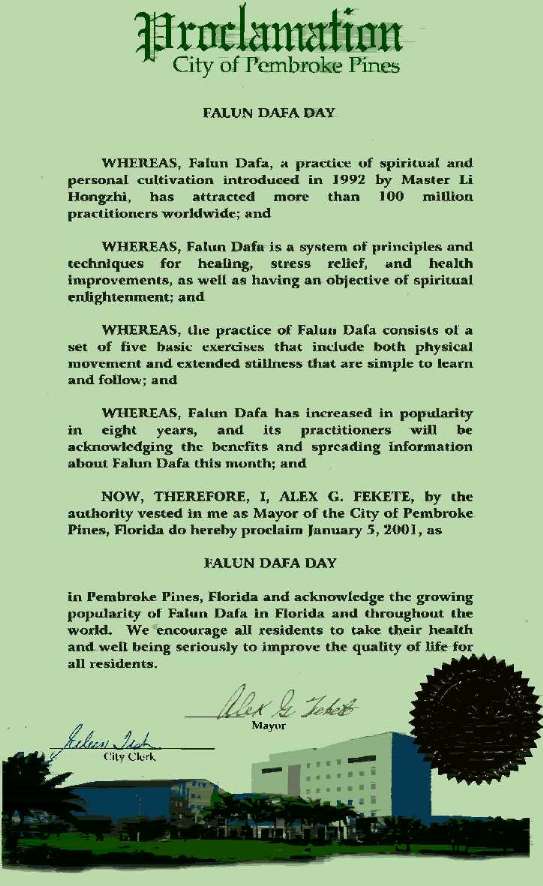 【明慧网2000年12月11日】 佛罗里达州潘布鲁克市宣布2001年1月5日“法轮大法日”