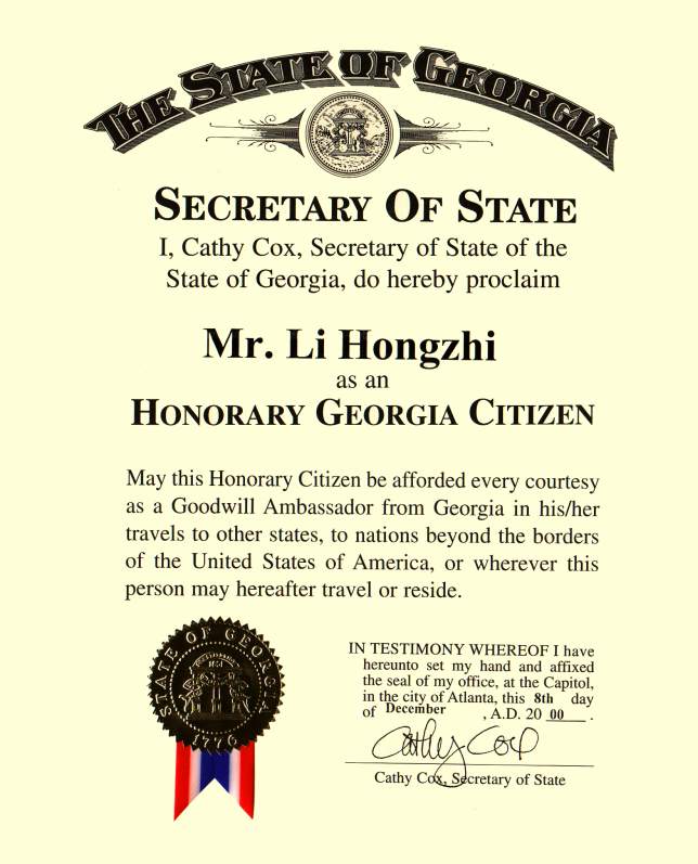 我郑重宣布李先生成为乔治亚州的荣誉公民,无论李先生在哪里居住或旅行,不管是在美国国内或国外,衷心希望李先生能够充份享受到作为乔治亚州亲善大使的礼遇。