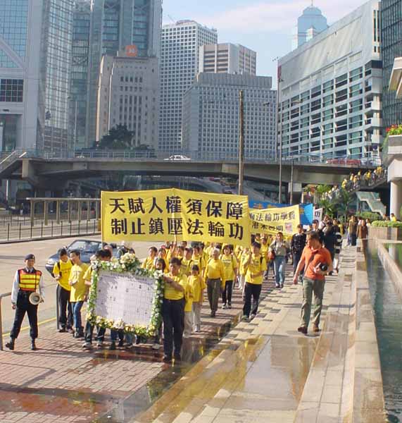 下午二时半后,学员以纪念花圈开路,在“天赋人权须保障,制止镇压法轮功”、“释放香港朱柯明”等主题横幅领路下,打着多面横幅,从遮打花园出发,浩浩荡荡地走过通向中联办的大道。沿路上还向市民派发最新一期的《清流》,不少市民都乐于接过来看。学员们感到经过近几个月来向世人讲清真相的努力,相当多的市民已经对大法有了更清醒的认识,现在无论在街上或在民房区洪法、发资料,都明显地比以前容易了,甚至社会上高阶层人士也开始给予我们同情与支持。我们都知道是师父以无比洪大的慈悲为众生承受造就了这一切的机会,我们在“助师世间行”的路上所能回报的,比我们力所能及应该付出的还差远去了。