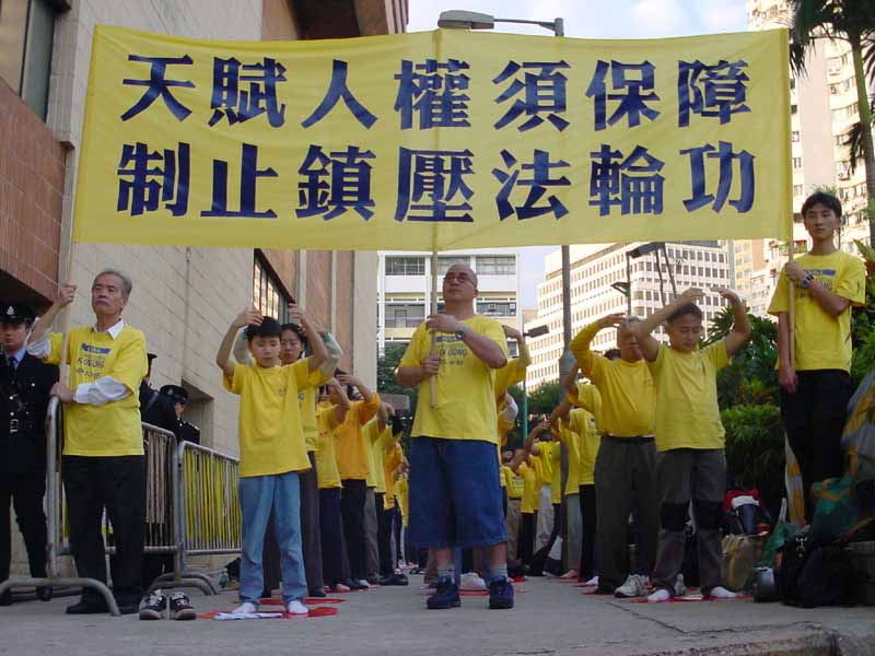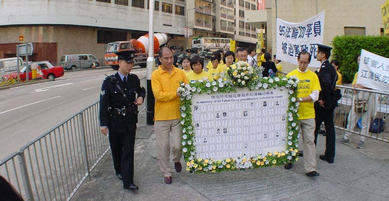 超过一百七十名香港学员和两名从澳门赶来的学员,中午后先在中环遮打花园集会,现场摆放了一个大型花圈,纪念九十五名被迫害致死的大陆学员。学员在集会上宣读了两份声明。一份是由立法会议员刘慧卿发起,并由李柱铭、何俊仁、张文光、涂谨申等十八名立法会议员联署的“保障法轮功学员的人权自由”声明。另一份是香港学员“在国际人权日致中国领导人的公开信”,信中促请朱镕基总理、李瑞环主席等领导人协助制止江泽民一夥对法轮功的残酷镇压迫害,还法轮大法及其创始人以清白,还法轮功修炼者人身自由和信仰自由。信中特别提到香港学员朱柯明因依法起诉江泽民而被非法拘禁,至今下落不明。