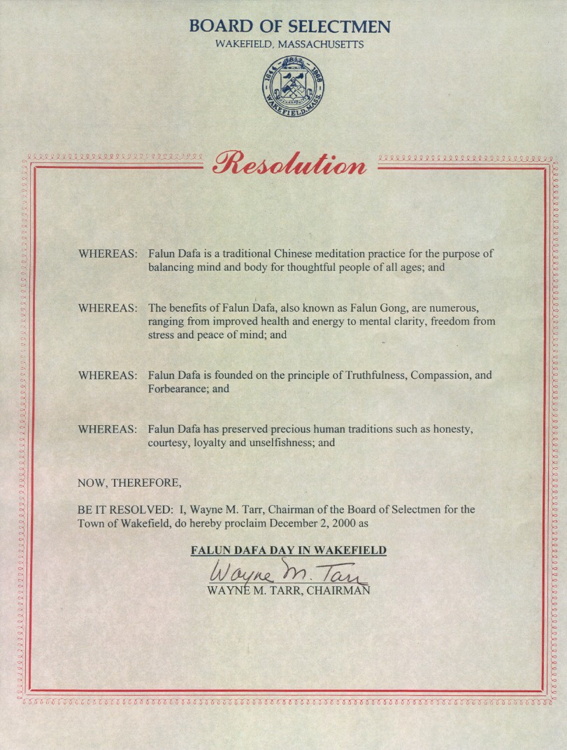 鉴于:法轮大法保持了人类珍贵的传统,诸如:诚实、礼貌、忠实和无私。
