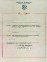 这是麻省的第一个法轮大法日。十二月二日这天,六十多位法轮大法学员纷纷从各城镇簇拥到威克费德广场参加庆祝活动。这一天,时值初冬,北风呖呖,加上湖面降温效应,好像是入冬以来最冷的一天,但学员们的热情却丝毫没有减退,大家动手打起了法轮大法和真善忍的横幅,架起图片展板,布置好洪法资料。然后随着美妙的音乐,大家排开整齐的方对,开始演炼五套功法。整个场面顿时变得祥和及温馨。过往的行人及车辆也纷纷驻足或减慢车速探望究竟。这时候镇上的报社记者也赶来了,对庆祝活动进行了现场采访和拍照。记者还了解到法轮功学员一直在此镇的图书馆及老人活动中心的义务教功活动,对法轮功学员及法轮功有了新的认识。广场功法展示完毕,紧接着在镇上的图书馆里又开始了法轮功的介绍及教功活动。有十来位对法轮功有兴趣的西方人士参加了这项活动。最后整个庆祝活动圆满结束。