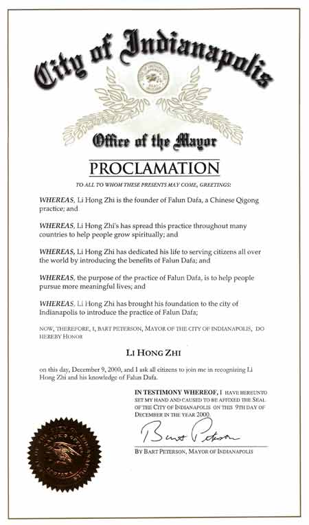 鉴于,李洪志给予了将法轮大法传到印第安那普利斯市的基石;