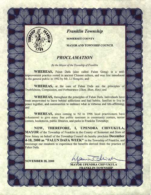 【明慧网2000年12月15日】新泽西州弗兰克林市市长宣布2000年12月4-10日为法轮大法周