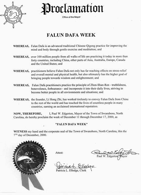 【明慧网2000年12月16日】 北卡州斯万丝布洛镇宣布2000年12月11 -- 17日 为“法轮大法周”