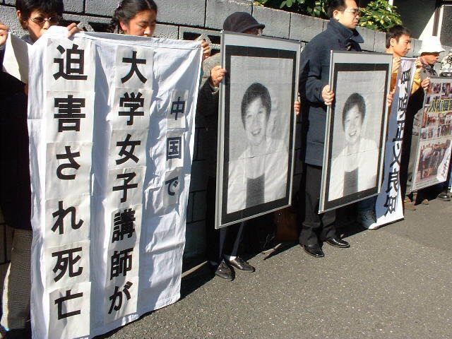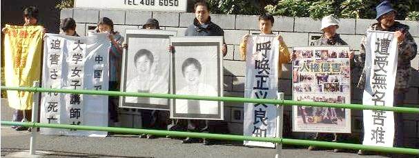 2000年12月15日,得知北京大法弟子赵昕因坚修法轮大法被恶警残忍打碎颈椎骨,在承受了难以想象的魔难6个月后安然离世的悲壮消息,日本大法弟子近30人前往中国驻日本大使馆前,举着大幅赵昕遗像,以及“遭受无名苦难,呼唤正义良知”等条幅,同时携带薄型液晶屏幕播放大法介绍录像,分发中日文大法报纸,向世人讲清真相。多少往来行人和汽车司机为之动容。