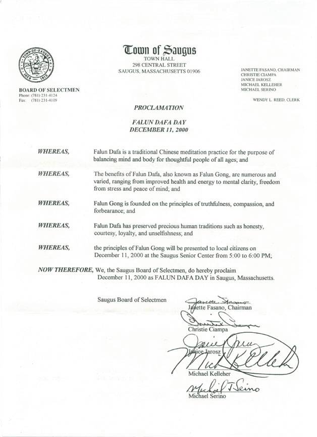 在此:我们,萨古斯镇管理委员会,宣布:2000年12月11日为麻萨诸塞州萨古斯镇“法轮大法日”。