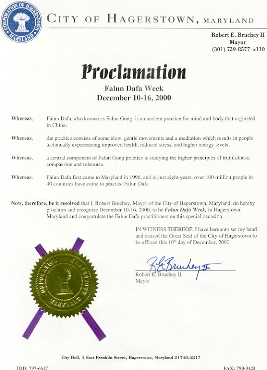 【明慧网2000年12月18日】 马里兰州罕格斯镇市市长宣布2000年12月10-16日为该市“法轮大法周”