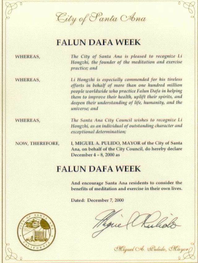 因此,我,米哥尔.A.普利多,圣塔安娜市市长代表本市议会宣布二零零零年十二月四至八日为“法轮大法周”,并鼓励圣塔安娜市市民考虑打坐和锻炼对于他们生活的益处。
