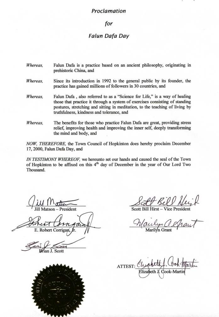 罗德岛州惠普金顿镇宣布2000年12月17日为法轮大法日