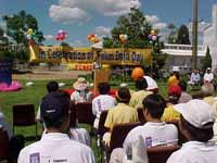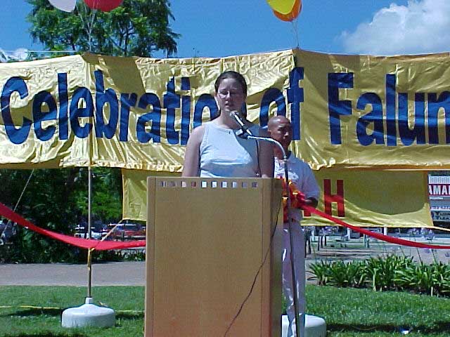 现场的草坪周围悬挂和摆放着大法横幅和印有法轮大法字样的彩色汽球,大型《转法轮》书模型和美丽的荷花,使整个会场显得庄重,祥和。市长布来博瑞(Bradbry)先生首先作了讲话,他赞扬了大法学员为该市社区市民身心健康所作的贡献,他说:他很高兴能经常在各社区文化节活动中看到大法学员在义务教功,炼功和宣传大法,能使人们身心都得到提高的活动当然是值得提倡的。鉴于此,布来博瑞市长致信当地的法轮功学员,以示支持。接着,布来博瑞市长为法轮大法日剪彩仪式进行剪彩。然后三位学员先后作了发言,向市民介绍了他们得法后从身体的健康,心灵的净化与升华中所受益无穷。庆祝活动在学员们演示5套功法后结束。(澳洲学员供稿)