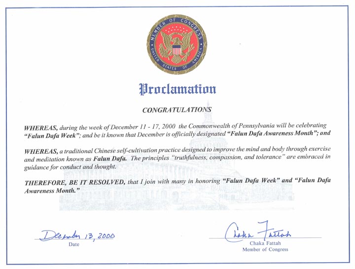 【明慧网2000年12月19日】 宾州国会议员查卡.法塔(Chaka Fattah)祝贺法轮大法周(2000年12月11日--17日)和法轮大法意识月(2000年12月)。