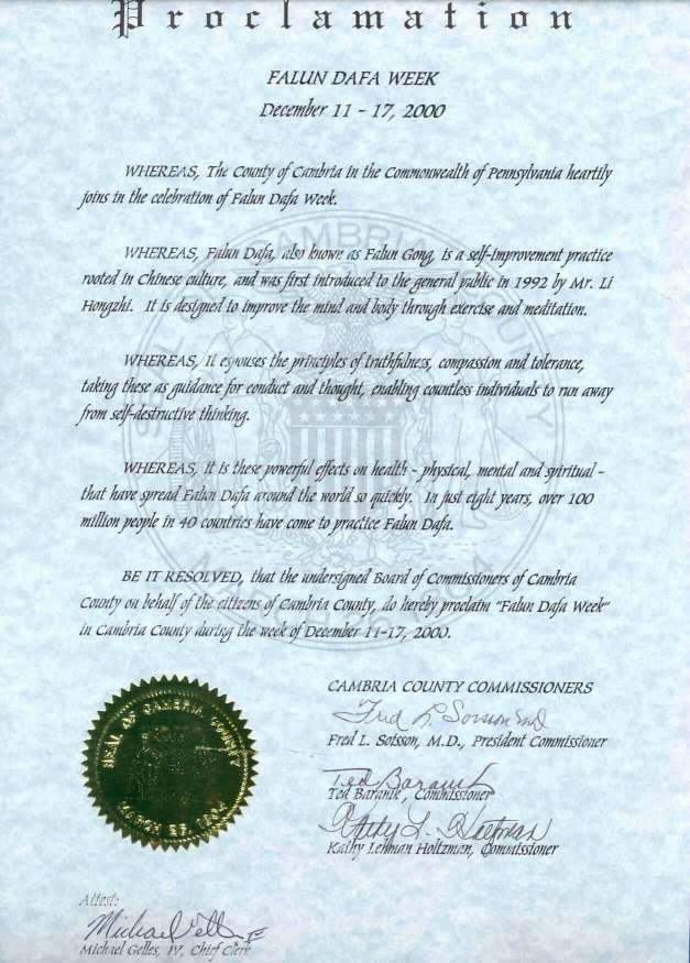 【明慧网2000年12月20日】宾夕法尼亚州坎布莱尔市宣布2000年12月11日-17日为“法轮大法周”。