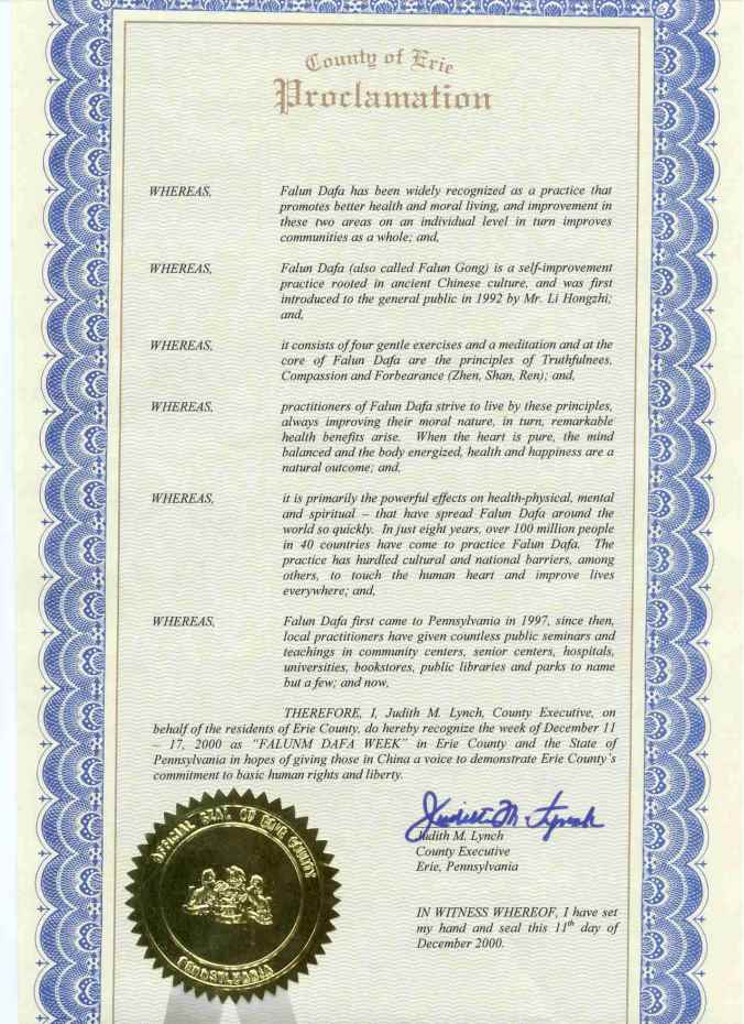 【明慧网2000年12月20日】 宾夕法尼亚州伊利县宣布2000年12月11日至17日为“法轮大法周 ”。