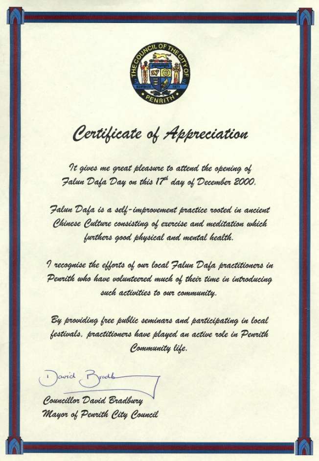 * 我很高兴参加2000年12月17号法轮大法日的开幕仪式。* 法轮大法是一种使人的身心都得到更加健康的自我提高功法,这一功法根植于古老的中国文化包括动作和打坐。* 潘瑞斯市的法轮大法修炼者们将他们的大量时间义务地为本社区介绍法轮大法,对他们所作的努力,我非常赏识。* 通过参加各种当地文化节活动和提供免费的教功活动,潘瑞斯的大法修炼者们在潘瑞斯的社区生活中发挥了积极的作用。