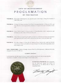 鉴于,我们向李洪志大师敬礼,以表彰他把法轮大法带给世人,并献身于给所有的人带来健康与美好的事业,不论他们来自哪个社会阶层,哪个种族,或持有何种宗教信仰...