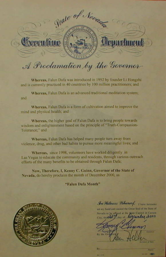 【明慧网2000年12月24日】 内华达州州长宣布2000年12月为全州“法轮大法月”