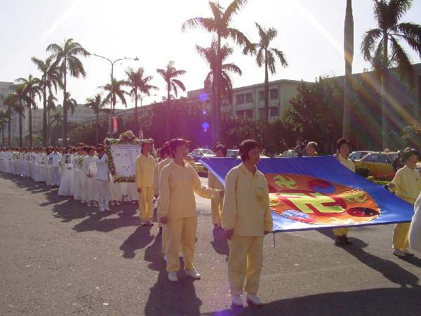游行队伍由中正纪念堂出发,台湾法轮功研究学会理事长张清溪发表声明指出,法轮功自一九九二年由李洪志传出后,八年传播到四十多国、有一亿人修炼,努力要求自己成为「真善忍」的好人;但中国政府却自去年七月开始大举镇压法轮功,至今未歇。